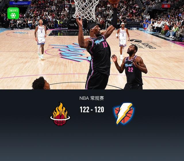 第四节热火阿德巴约拿下10分,雷霆亚历山大拿下9分,最终热火122-120战胜雷霆