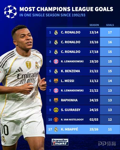而在欧冠单赛季进球排行榜上,姆巴佩距离C罗在2013/14赛季的17球纪录还有6球之差。